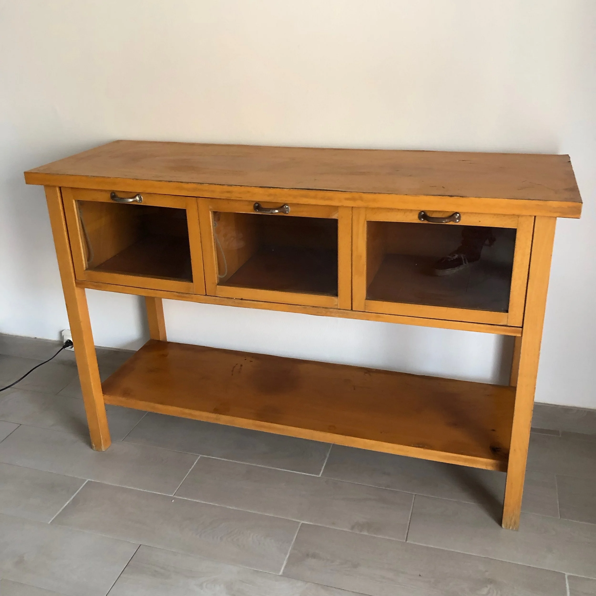 Ancien meuble de rangement en mélaminé, verre et métal circa 1980 dans son jus.
