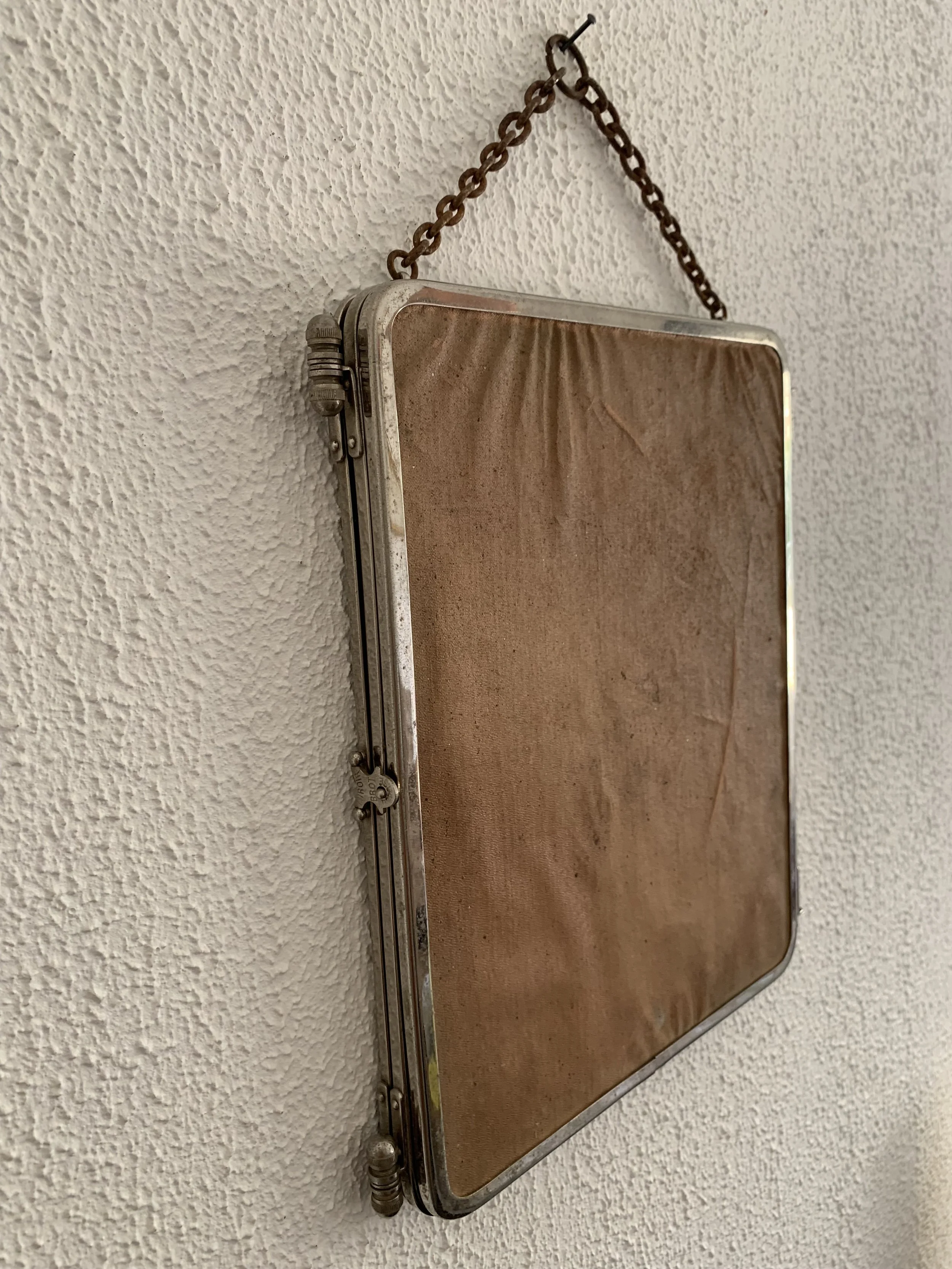 Ancien miroir triptyque de barbier coiffeur en métal chromé et tissu couleur chair circa 1930 dans son jus.