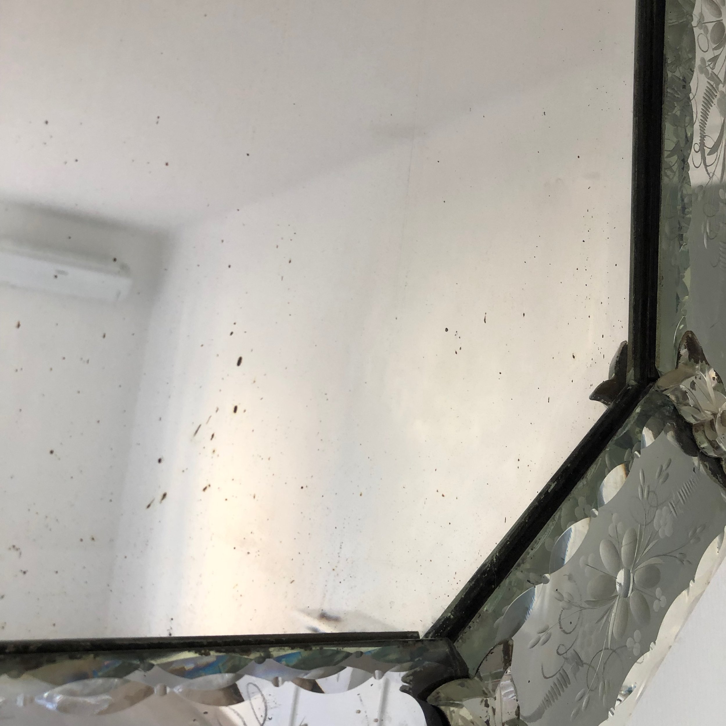 On peut simplement observer que les glaces affiches des mouches et décolorations du mercure qui ajoutent à sa superbe plus qu'elles ne lui nuisent d'autant qu'il n'y a qu'un éclat sur la partie basse qu'on ne voit que si on le sait.